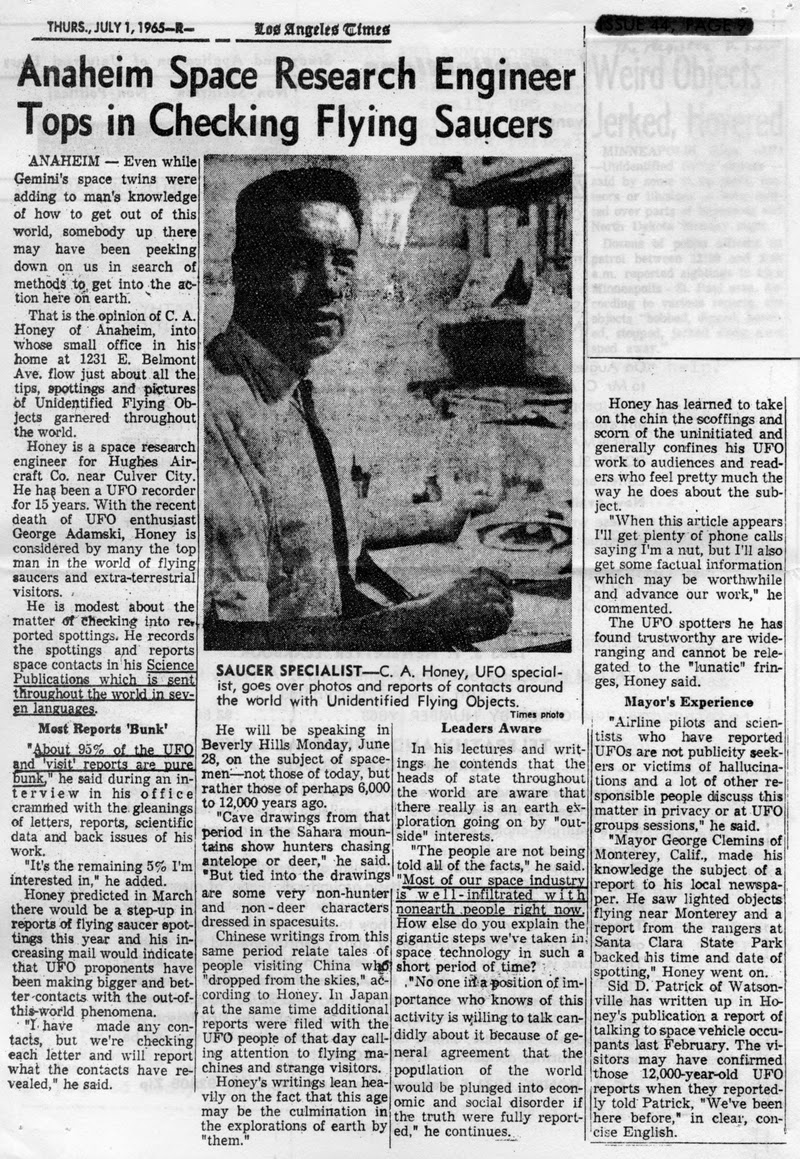 In a letter to Flying Saucer Review, March-April 1959, Carol Honey mention that his interest in UFOs began after observing a "huge UFO flying behind an airliner". He moved to California and started investigating witnesses and contactees but was disappointed when finding so many mystic channelers among the contactees. But things changed when he met Adamski: "I visited George Adamski at his home in November of 1957. I fully expected to hear the same type of story as I had been hearing. Instead I got a real surprise. Here was a story down-to-earth and not involving seances, trances and other such things as I had run into before." On a lecture tour with Adamski, Carol Honey had his first encounter with space people at a cafe in Oregon.